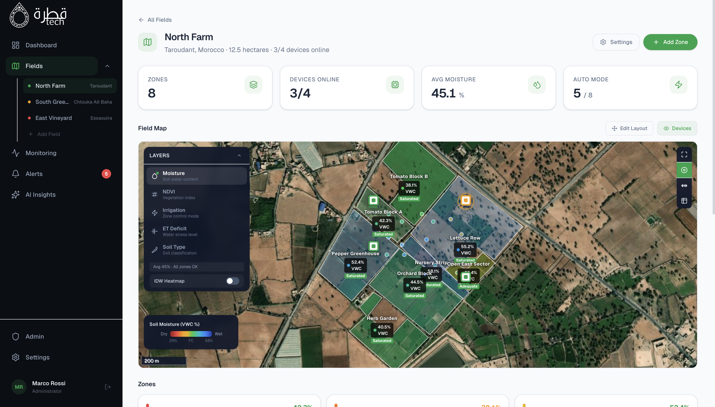 Dashboard completa con tutti i dati del campo. Umidità, temperatura, meteo, pH — tutto in un'unica vista. La decisione su quando e quanto irrigare resta completamente tua.