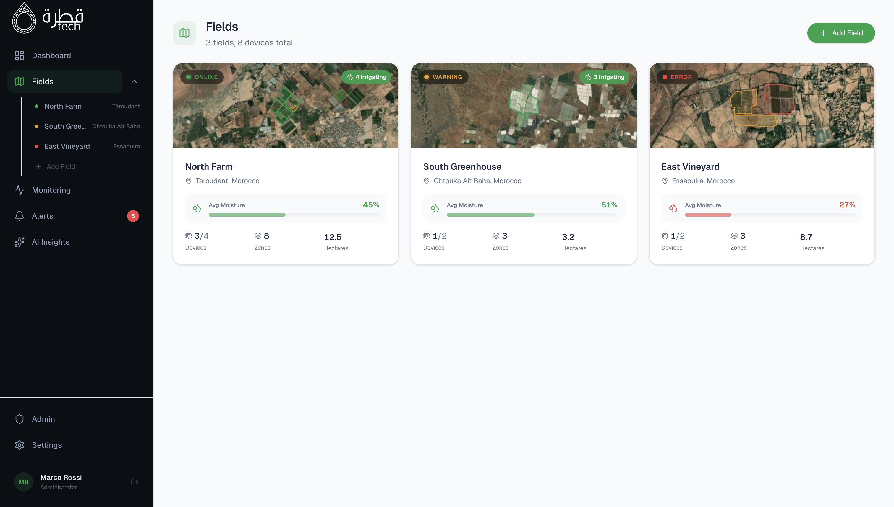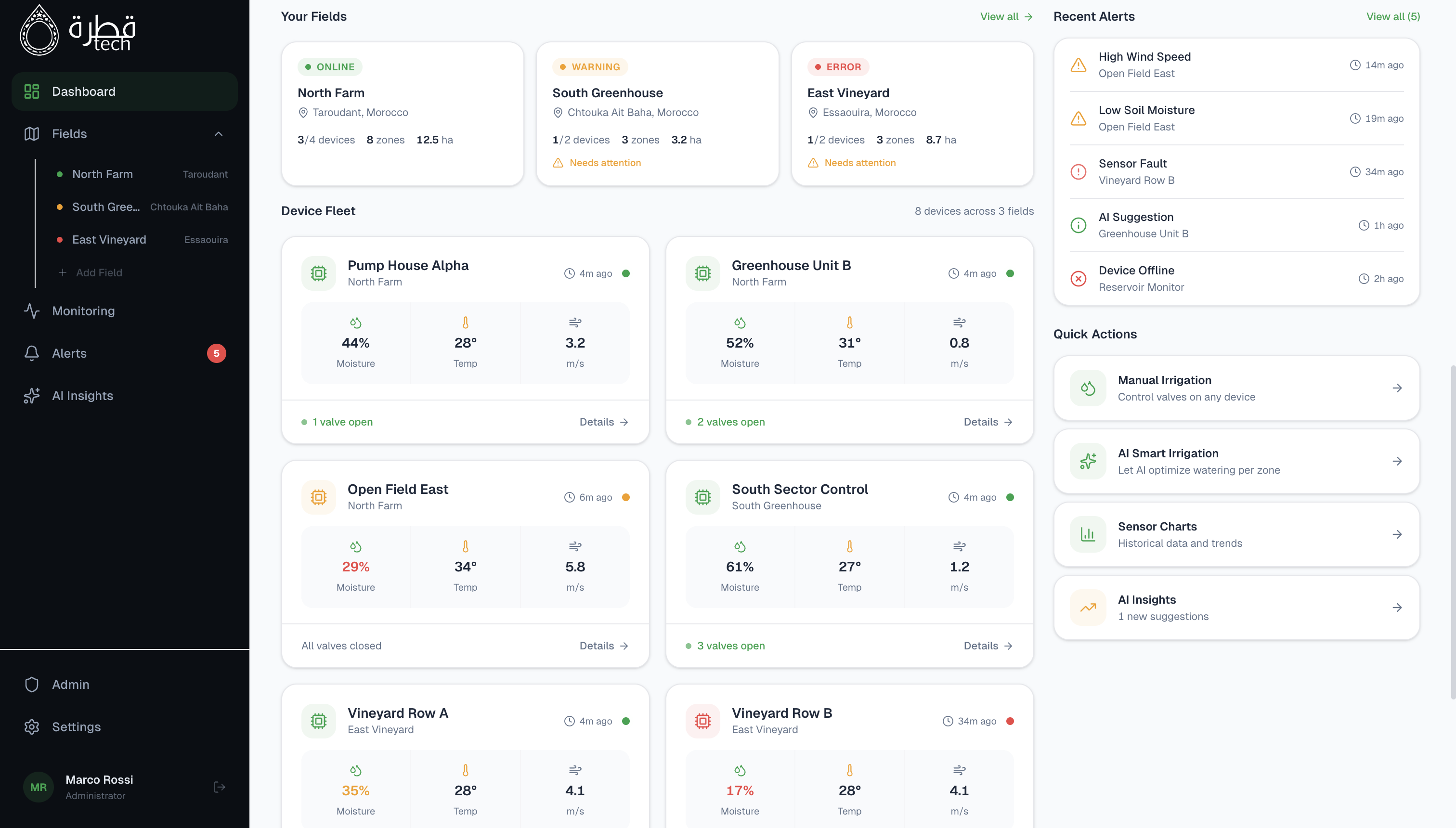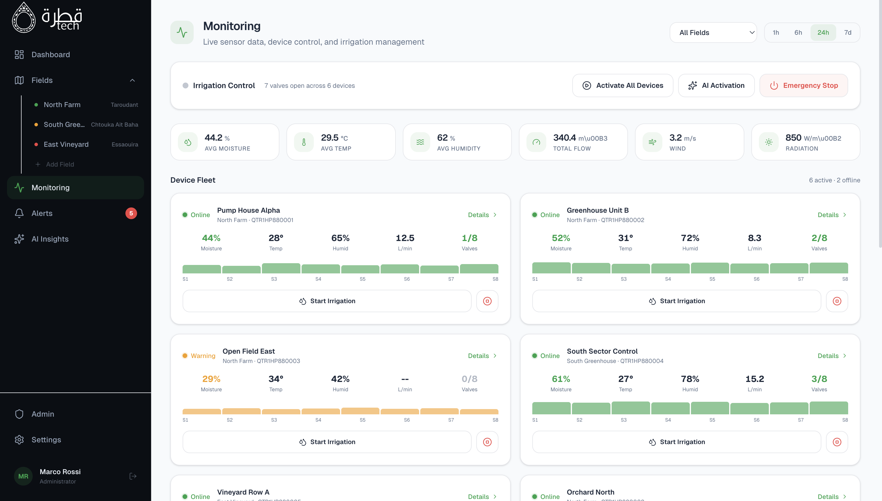 Sensori professionali nel campo, dashboard completa sul tuo dispositivo. Il sistema Quatra è progettato per essere installato in poche ore e darti il controllo totale della tua irrigazione, ovunque tu sia. I sensori sono i muscoli, l'app è il cervello pensante del nostro sistema.